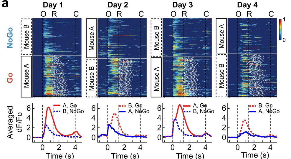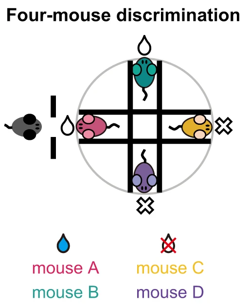 Більше того, коли вже навченим тестовим мишам пред’являли іншу четвірку стимульних, активність приблизно 9% нейронів була пов’язаною із розпізнаванням індивідуальних тварин навіть без винагороди (поїлка прибрана).