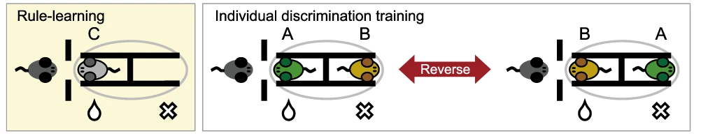 На початку навчання у одному з відсіків була стимульна миша, а інший був порожнім. Пред’явлення тварини було асоційованим із водою – автомат подавав у трубочку краплинку. Коли ж стимульна платформа була порожня, води не було. Тестові тварини досить швидко навчалися цьому правилу. Тоді задачу ускладнювали: тепер на обох платформах були миші, лише одна з яких забезпечувала отримання води. Їх пред’являли у псевдовипадковому порядку сотні разів за тренувальну сесію.