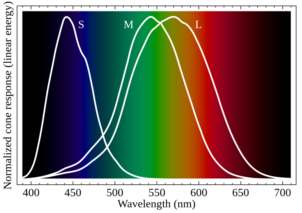 Нагадаємо, що наш кольоровий зір обумовлений наявністю у “денних” фоторецепторах – колбочках – трьох типів фоточутливих пігментів. Максимум їхнього сприйняття лежать в ділянках синьої, зеленої та червоної частин спектру.