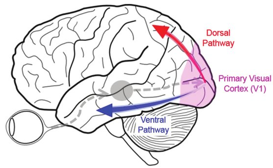 Вентральна підсистема зорових нейромереж сполучає зорову, потиличну кору із нижньою скроневою, вона аналізує контрасти, форми та кольори, ідентифікує певні об’єкти, а відтак отримала назву “система ЩО”. Натомість дорзальний зоровий шлях, що прямує до тім’яної кори, “заточений ” під детекцію рухів та аналіз розмірів і положення об’єктів у просторі; тут немає, зокрема, інформації про колір. За допомогою цієї системи ми нездатні ідентифікувати та назвати об’єкти, проте вона адаптує наші рухи до взаємодії із довкіллям, через що отримала назву “зір для рухів” або “система ДЕ”.