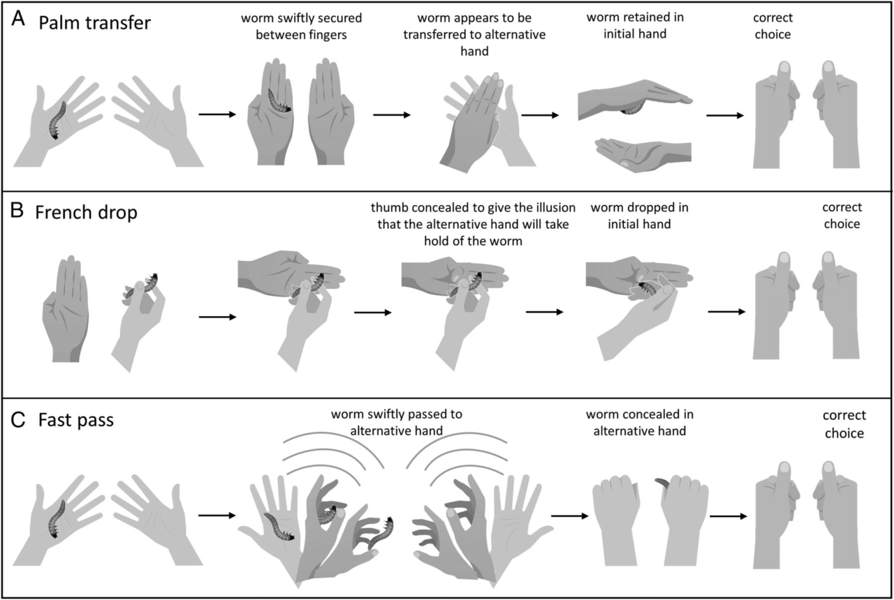 Поміж тварин, воронові птахи є дуже розумними. Проте, будова їхнього мозку істотно відрізняється як від людини з іншими приматами, так і від неприматових ссавців. Тож, дослідники вирішили вивчити, як ці птахи реагують на три базові магічні прийоми: ми не знайшли українські відповідники їхніх назв, але суть цілком зрозуміла з наведеного рисунка. Перші два з них з них використовують здатність нашого мозку до передбачення, прогнозу результатів дій на основі типових маніпуляцій. Тож, для того, щоб бути обманутим, потрібно мати мозок, навчений аналізувати рухи у певний спосіб. Третій трюк має в основі швидкі рухи, що ускладнюють сприйняття їх результатів.