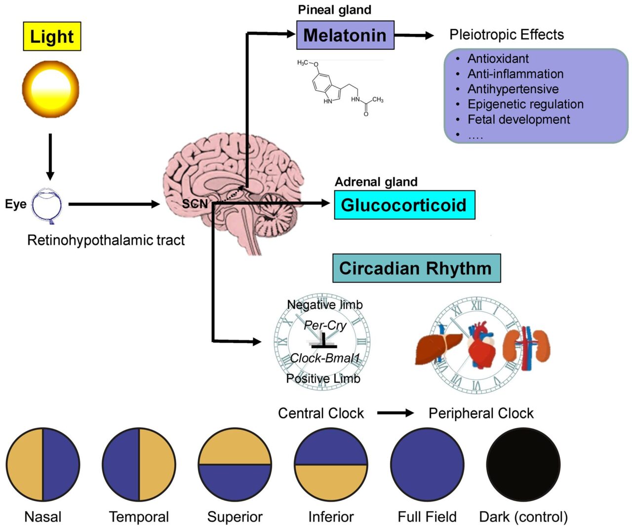 Наша добова ритміка зав’язана, зокрема, на зміни рівня освітлення. Від ока ця інформація складним шляхом мандрує до епіфіза або шишкоподібної залози. Це частина проміжного мозку, яка синтезує гормон мелатонін. Він гальмує активність гіпофізу, котрий керує багатьма іншими залозами. Вдень інтенсивне освітлення зменшує вироблення меланоніном, а отже гіпофіз, а разом із ним і інші залози, наприклад, щитоподібна та надниркова, більш активні. Вночі навпаки.