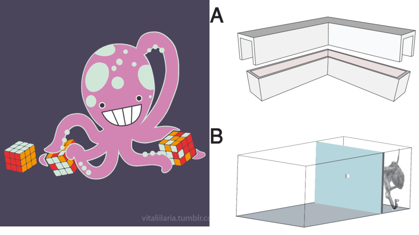 Щоб зрозуміти когнітивні здібності восьминогів, дослідники провели цікавий експеримент. На першому етапі тваринам потрібно було навчитися відкривати L-подібний контейнер зі смаколиками. На другому етапі вони повинні були дістати цей контейнер через невеликий отвір експериментальної установки. Задля цього тварини повинні були як тягти, так і штовхати об’єкт. Далі проблему ускладнювали різною просторовою орієнтацією контейнера, розміщенням непрозорої перешкоди. Усі тварини непогано впоралися із завданням, що є підтвердженням їхньої високої здатності до навчання.