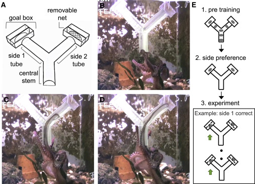 Дослідники вчили восьминогів діставати їжу у спеціально розробленому Y-подібному лабіринті. В ньому тварина мала просунути у “головну” трубку одну з рук, а надалі обрати праву чи ліву трубку, в яких могли бути доступними смаколики. У першому експерименті їх вчили обирати правий чи лівий відсік. Виконання цього завдання вимагало використання пропріоцептивної інформації – тобто знання, де та в якій позиції знаходиться рука, якою вони зараз працюють. Далі завдання ускладнювали. Одна з частин установки мала гладеньку поверхню, інша ж – шорстку. Восьминоги повинні були навчитися обирати напрямок за типом поверхні, а не за правилом правий-лівий. П’ять з шести тварин успішно із цим впоралися.